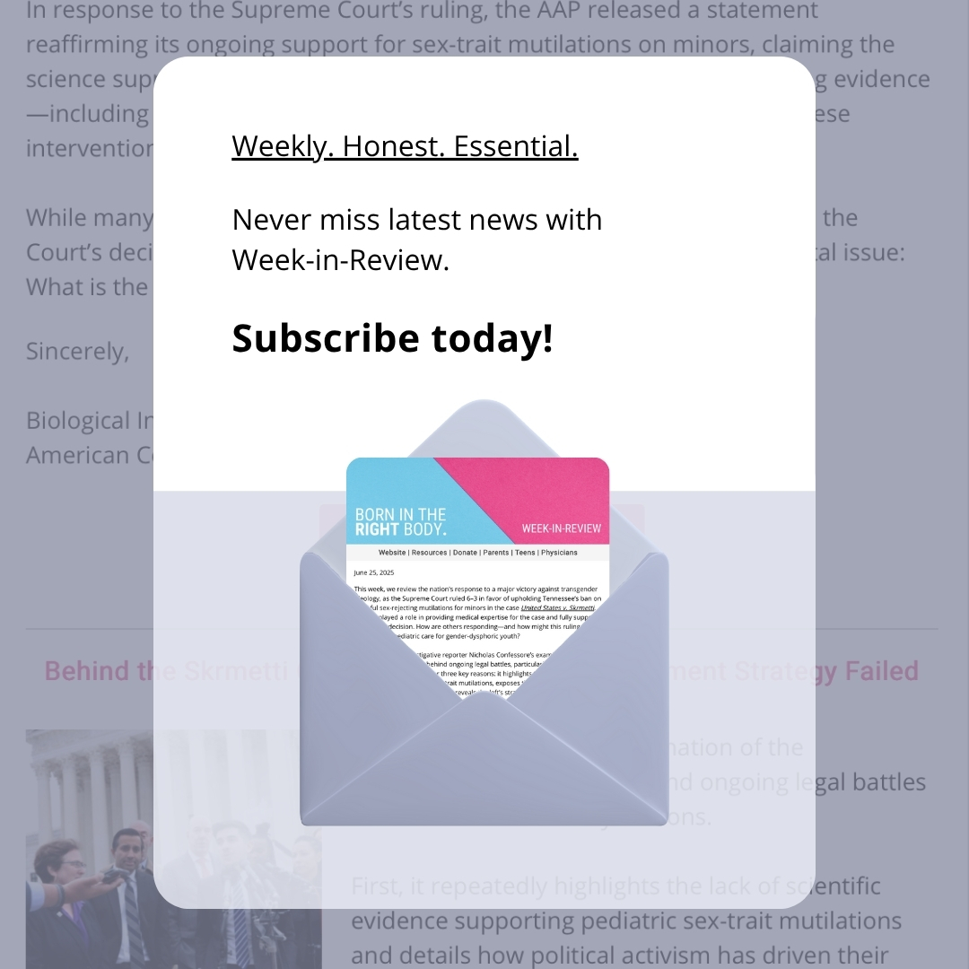 Sign up to receive a weekly updates from Biological Integrity on the latest news, legislation, and research protecting children from harmful transgender ideology—plus a monthly newsletter from ACPeds.